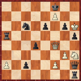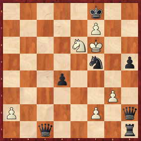 W tej pozycji K. Skirzewski (białe) zagrał 1.K:g6. Nastąpiło 1...Se7+ 2.Kf6 Wf5+ 3.Hxf5 Sxf5?? 4.Sg5 c1H 5.Sxe6 mat.